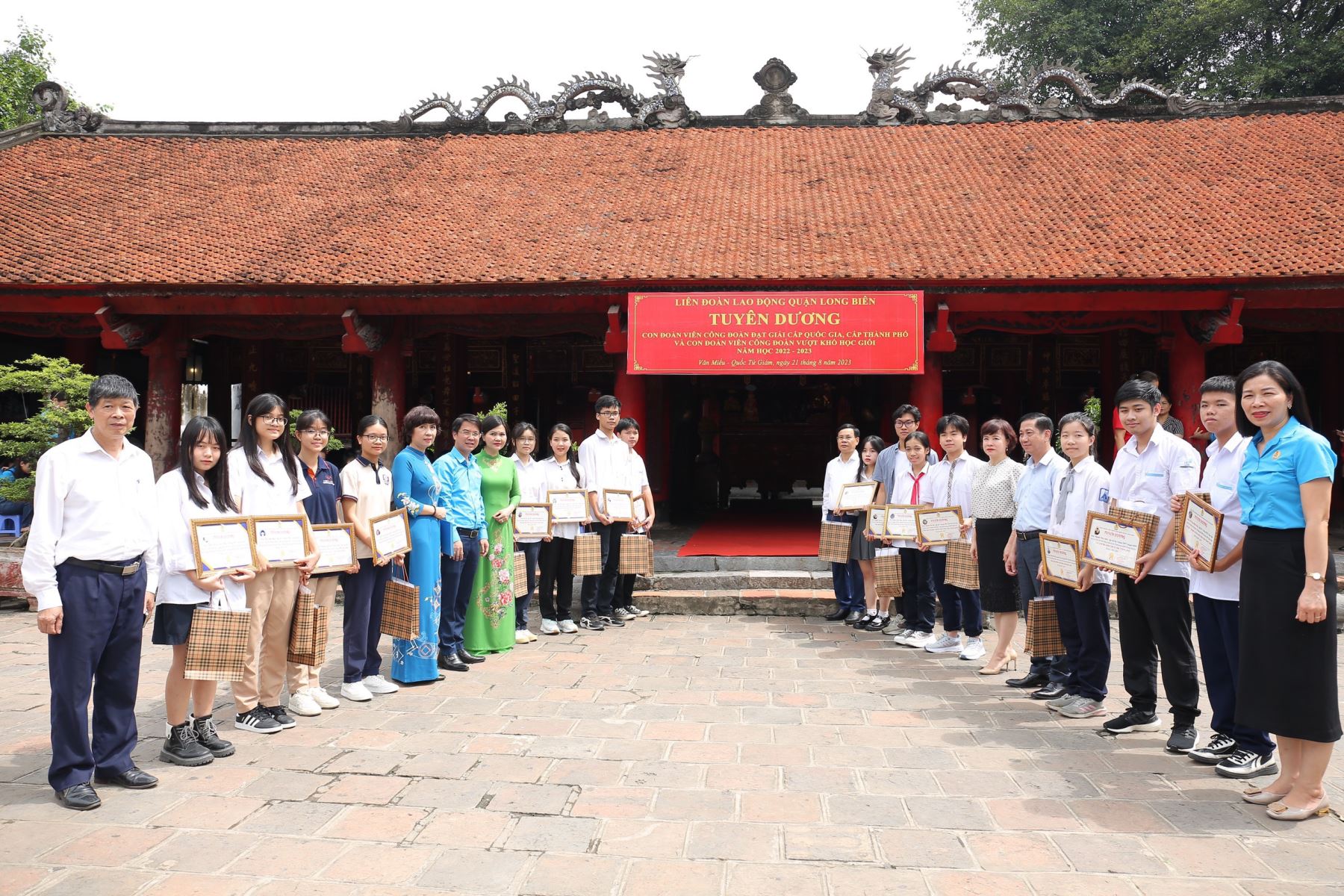 Phần cuối của buổi lễ trang nghiêm và xúc động, BCH LĐLĐ quận Long Biên đã trao phần thưởng cho các cháu. Các cháu rất tự hào và xúc động khi được tuyên dương tại Văn Miếu thờ Tư nghiệp Quốc Tử Giám Chu Văn An - người thầy tiêu biểu đạo cao, đức trọng của nền giáo dục Việt Nam; đồng thời cũng là nơi thờ Khổng Tử và các bậc hiền triết Nho gia. Xin được cảm ơn sự quan tâm sâu sắc của LĐLĐ quận Long Biên đối với các em học sinh trước thềm năm học mới. Mong rằng các em học sinh quyết tâm phấn đấu vươn lên trong học tập, tiếp nối truyền thống văn hiến – truyền thống giáo dục rực rỡ của quê hương đất nước.