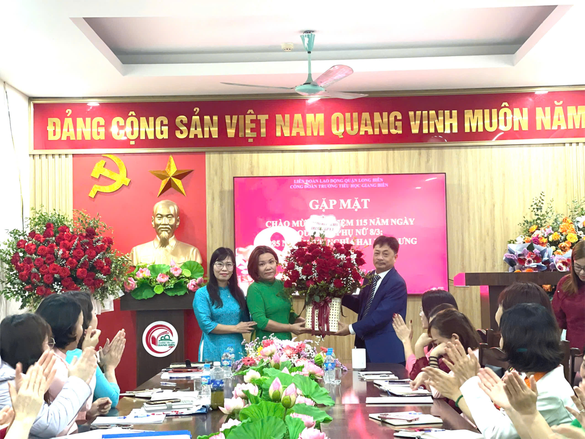 Hòa chung không khí phấn khởi chào mừng Ngày Quốc tế Phụ nữ 8/3, chiều ngày 03/3/2025 Nhà trường và Công đoàn trường Tiểu học Giang Biên đã long trọng tổ chức chương trình kỷ niệm nhằm tôn vinh những đóng góp to lớn của các nữ cán bộ, giáo viên, nhân viên nhà trường. Đồng chí Nguyễn văn Kỳ - Bí thư chi bộ, Hiệu trưởng nhà trưởng đã gửi những lời chúc tốt đẹp và lãng hoa tươi thắm tới toàn thể nữ viên chức người lao động nhà trường. Đây không chỉ là dịp để ôn lại truyền thống vẻ vang của phụ nữ Việt Nam mà còn là cơ hội để tập thể nhà trường thể hiện sự trân trọng, ghi nhận công lao của các chị em trong sự nghiệp trồng người.