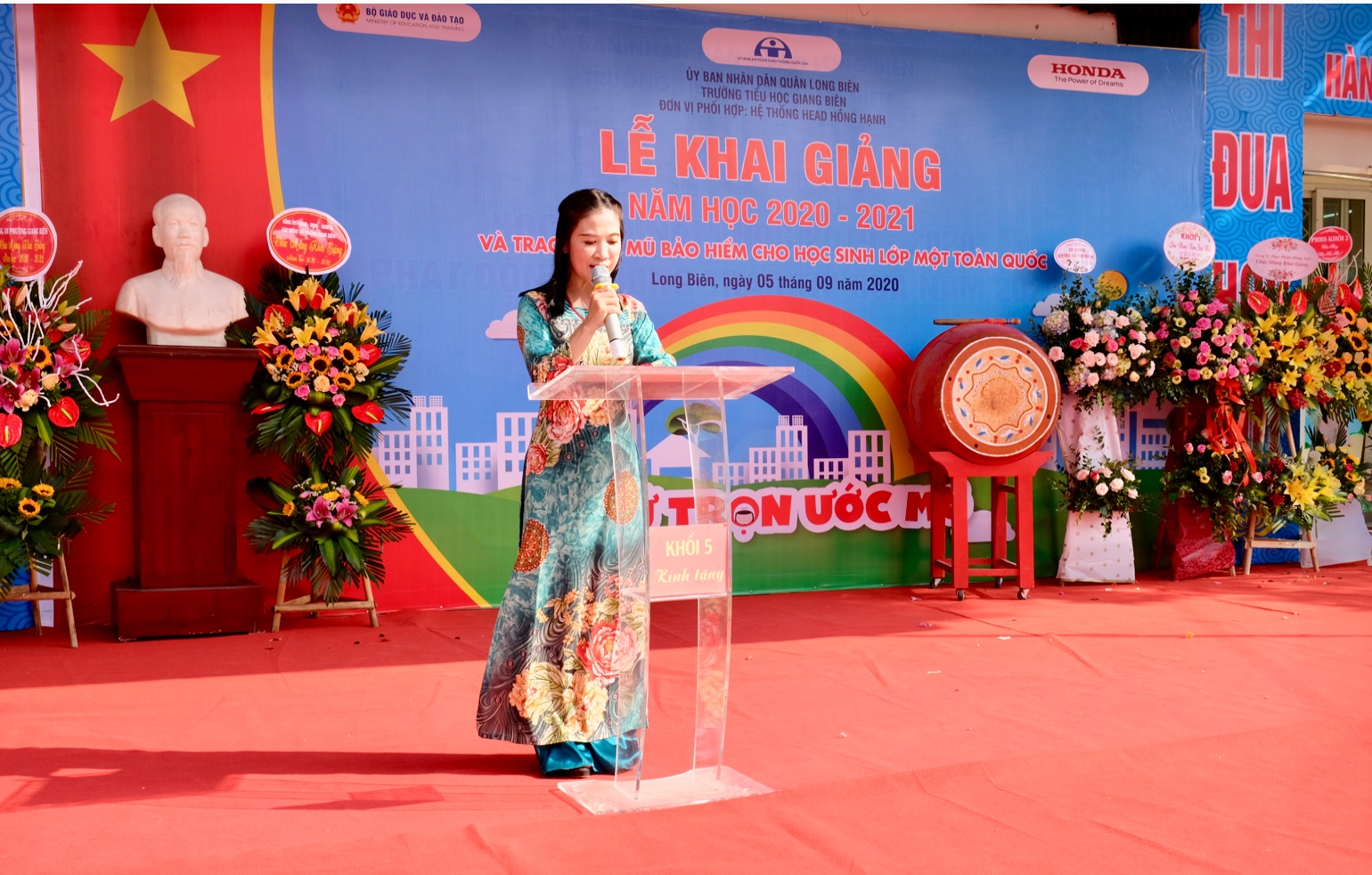 Phát biểu tại buổi lễ khai giảng, cô giáo Hiệu trưởng Hứa Thu Huyền đã ân cần, căn dặn học sinh “ Các con hãy chấp hành tốt luật an toàn giao thông, nhớ đội mũ bảo hiểm đạt chuẩn khi tham gia giao thông bằng xe gắn máy, xe đạp điện; nhớ thực hiện tốt các biện pháp phòng,chống dịch Covid-19 để đảm bảo an toàn, sức khỏe cho mình và cho mọi người. Ngoài việc lễ phép, vâng lời thầy cô giáo, biết đoàn kết yêu thương các bạn, các con nên nhớ: lễ phép chào hỏi, tôn trọng đối với khách đến trường, với nhân dân nơi cư trú; các con hãy tự tin, mạnh dạn đề xuất những ý kiến của mình với các thầy cô giáo và nói lên những ước mơ, nguyện vọng của bản thân; các con sẽ nhận được sự hướng dẫn, khuyên bảo ân cần của các thầy cô giáo..”.